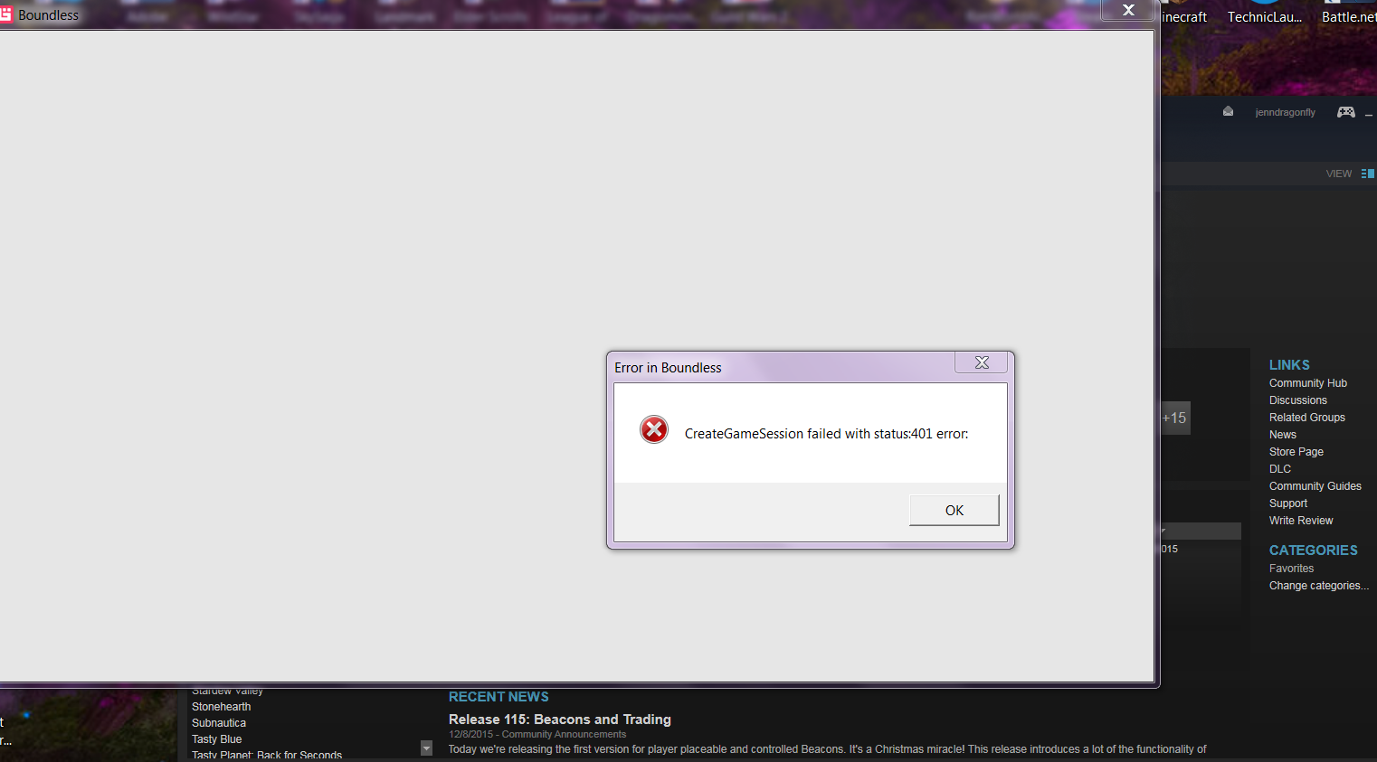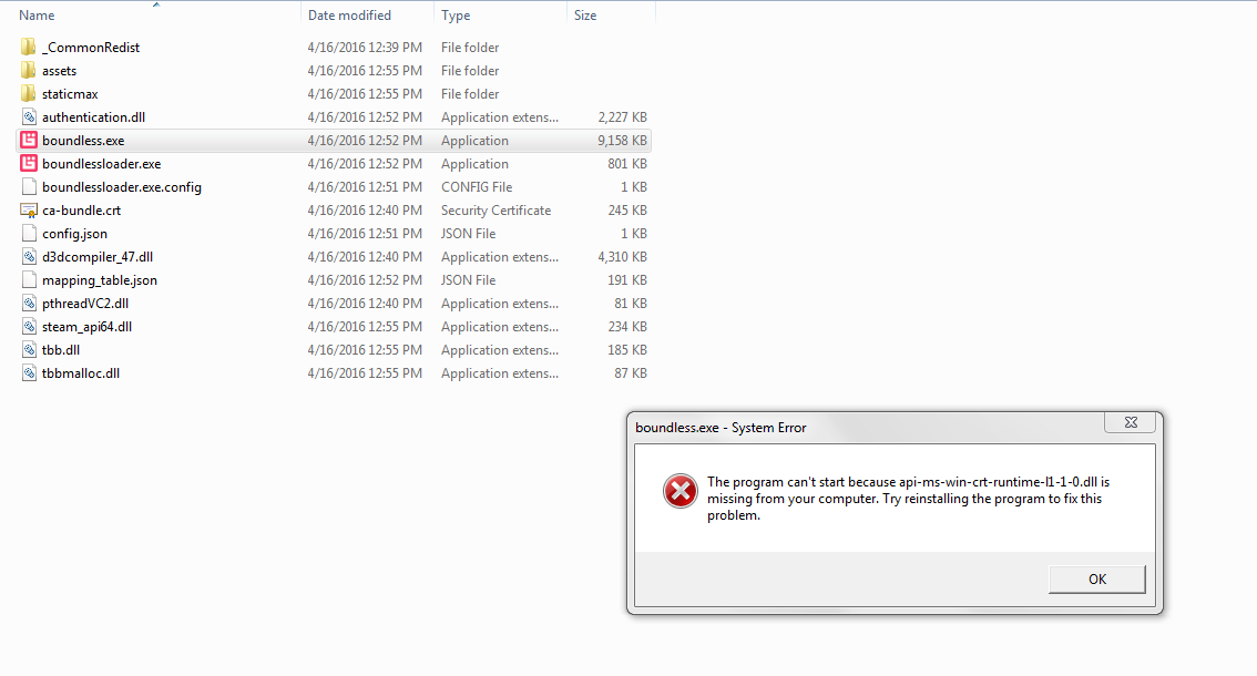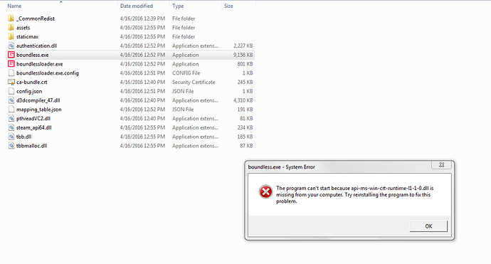 I have tried to start the C++ beta, but every time I do, my steam window says it is running for a short time, and then syncs the game and stops running. Originally I would get an error message (don’t remember what), but I allowed it to just collect info and it stopped appearing. After trying to run the boundless.exe in the files, I got this error. I re-installed boundless, and the same problem happened.