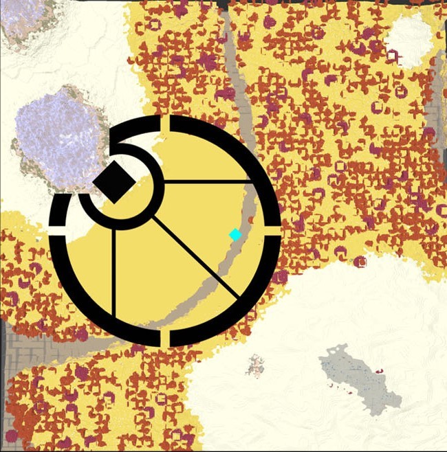 Here is a basic concept of the city layout we’re considering the strongest from the small group. The black diamond is the position of the proposed portal hub / palace thing, and the blue diamond is the spawn point.