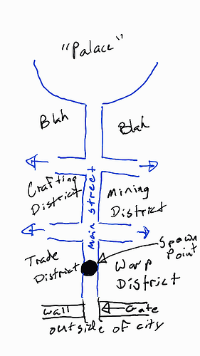 OK so, as I mentioned earlier, a quick sketch of a linear city layout. This could be nestled nicely with the palace up against the side of the mountain for a nice secure feel. Pardon the low quality of the sketch, I did it with my cell phone. I feel it conveys the simplicity of the organization well enough though. Obviously, the blue road down the middle and it’s spokes represent “Main streets” and smaller streets through the district are not shown. This layout is done for the simple purpose of maximizing efficiency, and ease of navigation while putting the features players will most often go to town for closest to the spawn point. At the same time, the fanciest builds are not obscured by surrounding city, and the player can quickly leave the city by the nearby main gate.