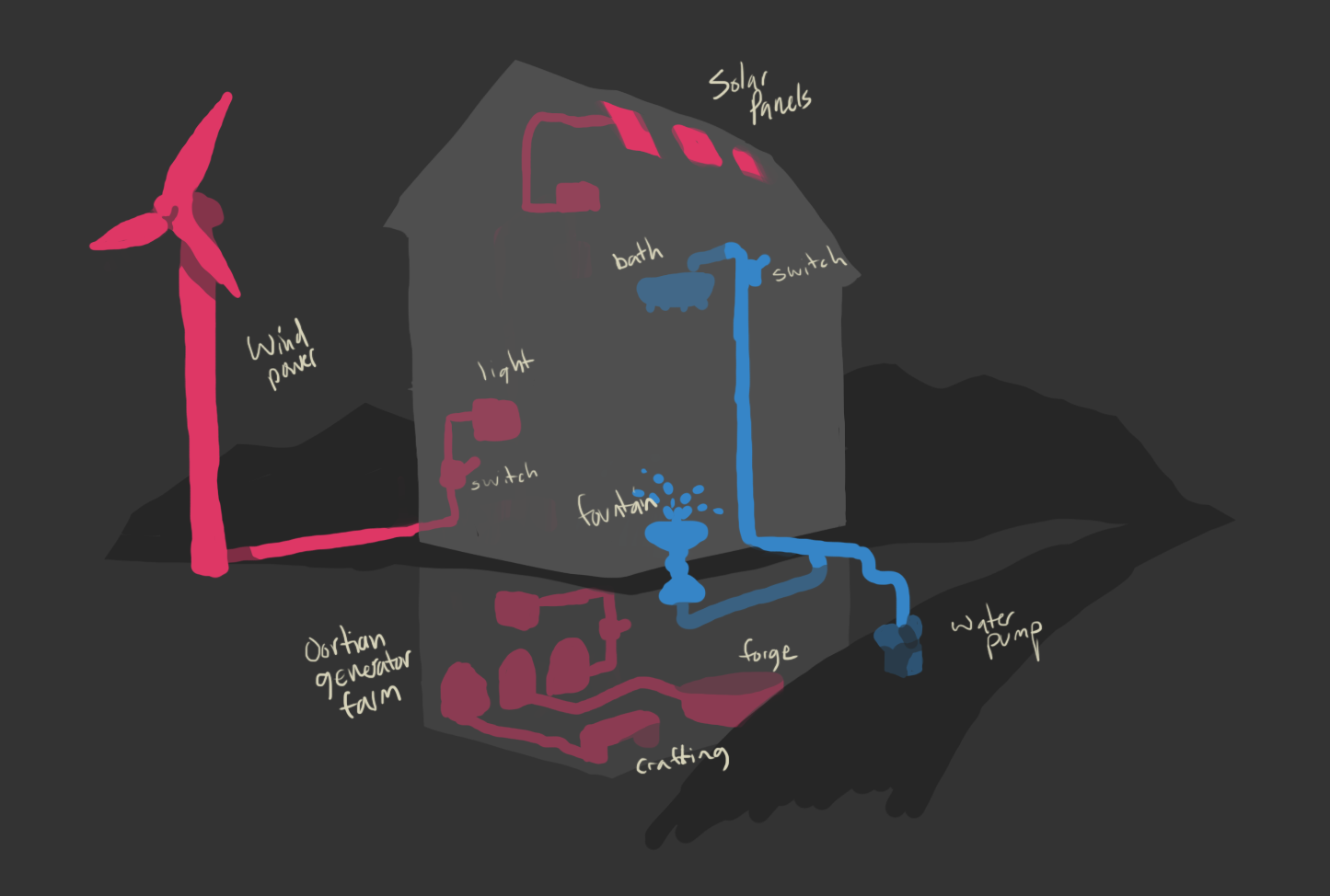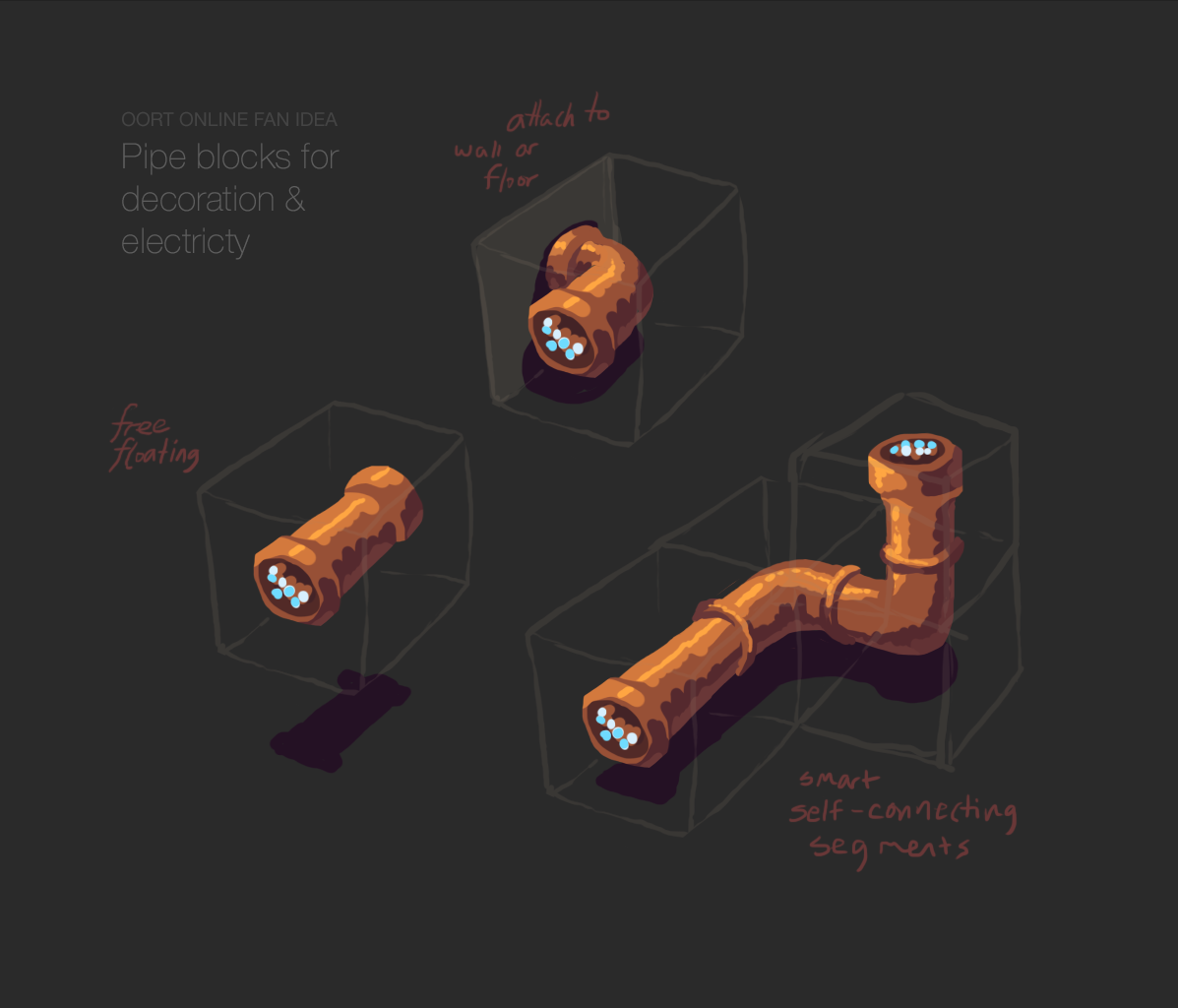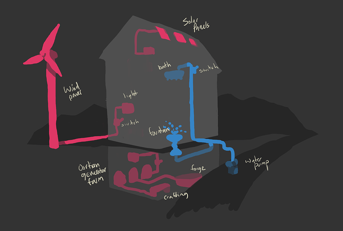 there would then be different lines (kinda like pipes as mentioned) there would be transfer blocks and ‘‘end blocks’’ meaning that it has the shine on top, if you place the thing you want up top of that block, it will get power.