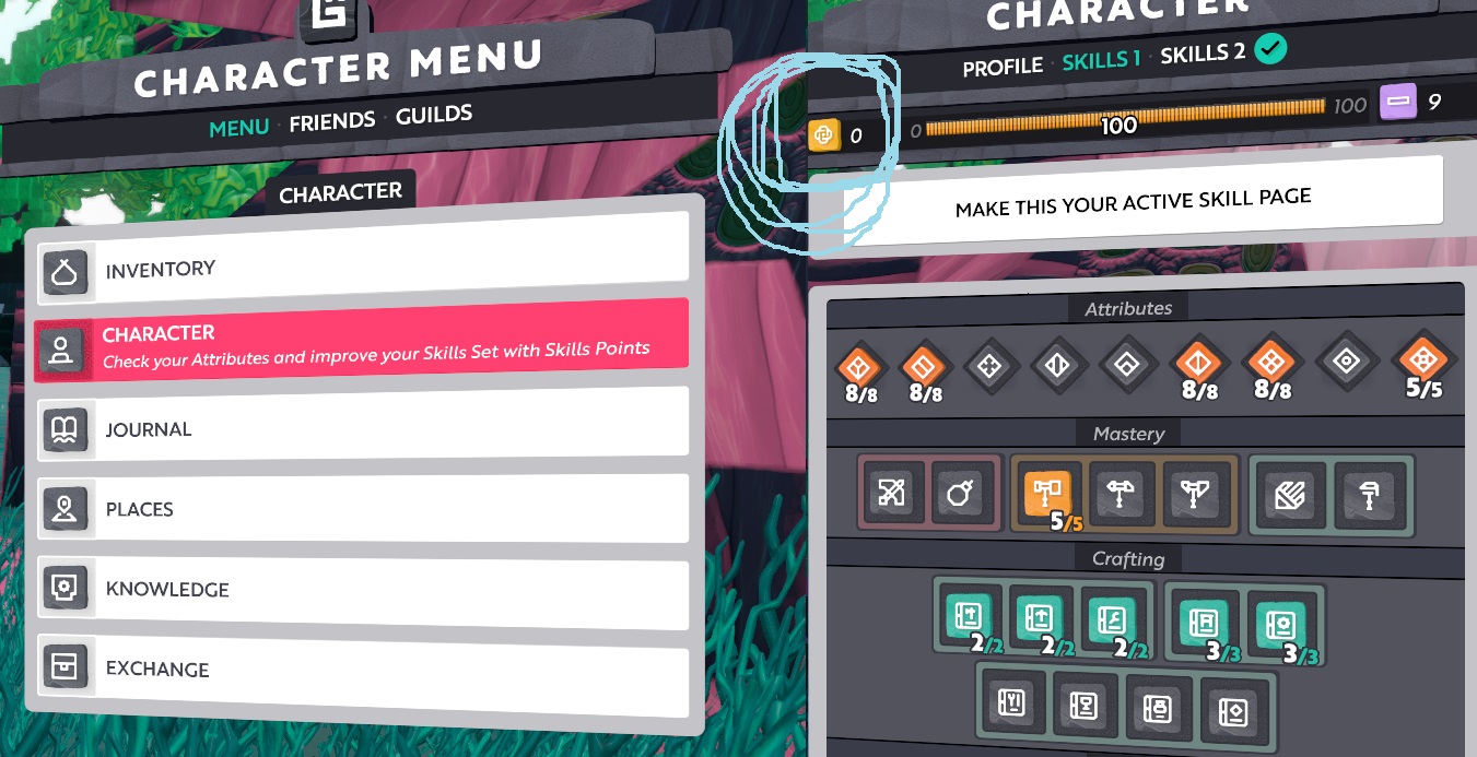 To complement Vex’s answer, the gold icon is the number you can use to increase skills, and the purple is the number of skills that you can ‘unlearn’ to reuse the points (right click on the PC, not sure on PS4)