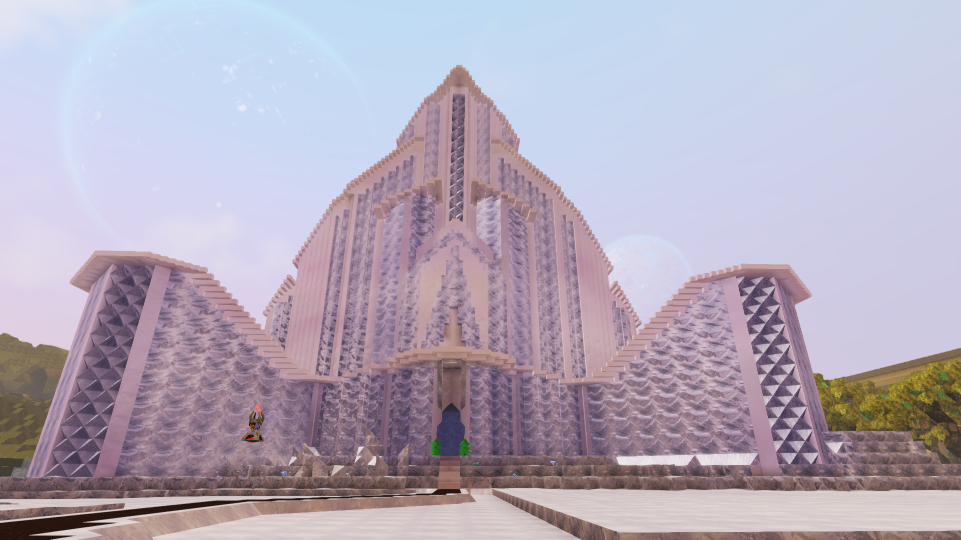 The portal is 3 layers thick. The inner layer provides a gap with (lattice+bevel) chiseled gleam and water. The chiseled gleam doesn’t disturb the waterflow so the water can pass through it and flow down. I’ll add iron octigrid to walk on since water can pass through that one as well but it’s not really needed with just one layer of water.