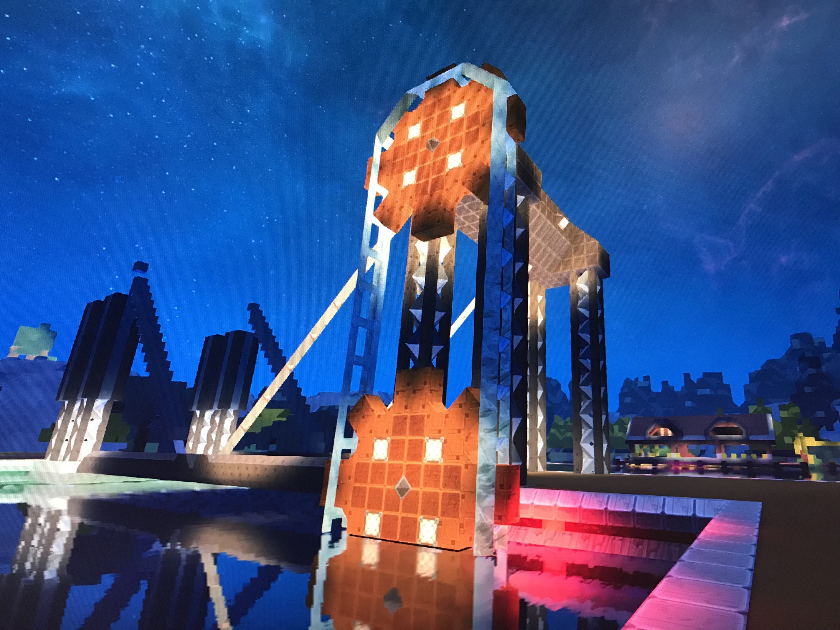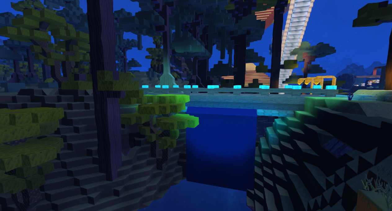 Lol. Thank you. Yeah, it’s super bright. Each pillar on the square represents a refined gem and then the gleam helps light them up because it’s super dark at night. Underneath the raised area was super dark no matter if it was day or night so I used gems to reflect light off the lanterns.