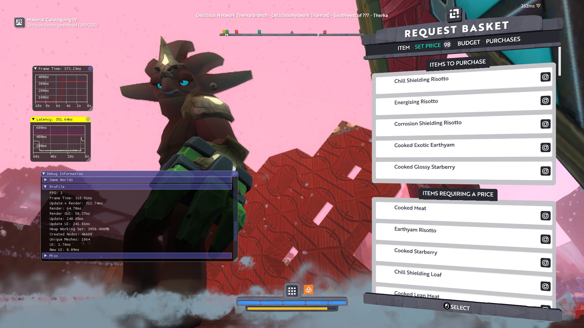 dunno if it is a bug or error in coding but try to put a request basket then add for example cooked meat and choose couple more dishes from the list and set a price then fps will almost freeze the game. in my case i chose 4 items from the list and fps went down from 102 to 0-4 max but only on the price set tab, also ping rises from 40-60 to over 250 and more. Need more testing!! Can someone check this as well?