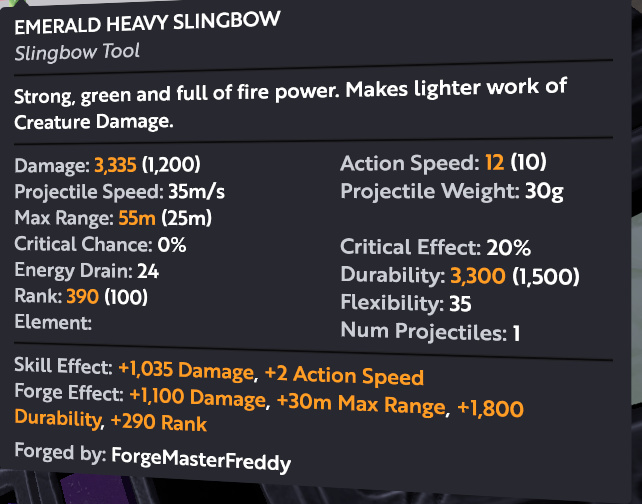 The problem is the projectile weight makes the projectile ammo drop down way shorter than the 30m you gain from the forge. This is probably gonna be better on a balanced or swift slingbow.
